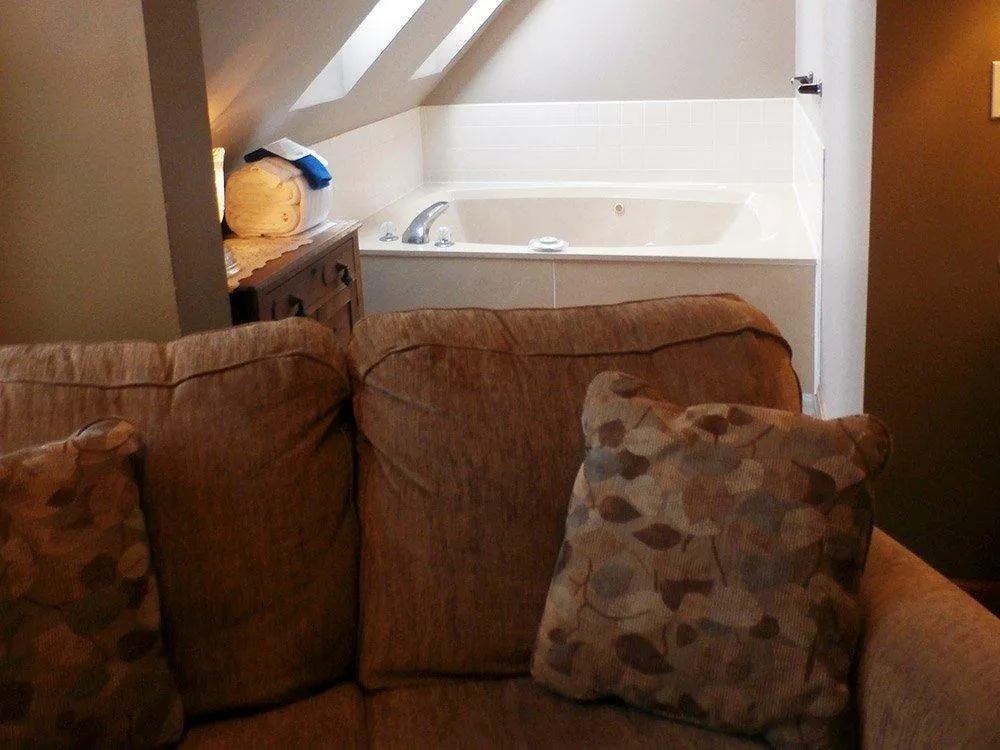 Room #10 has a dramatic antique queen bed, skylight above large marble whirlpool tub, gas fireplace, and a north-facing window on the third floor of the main building.