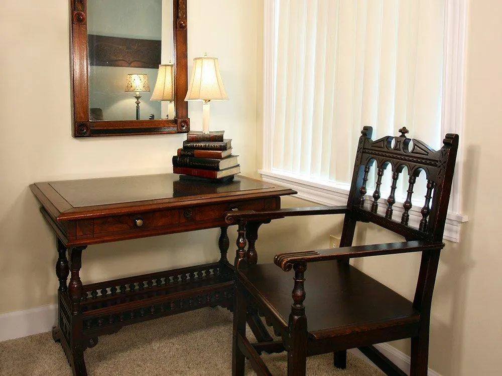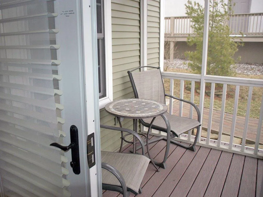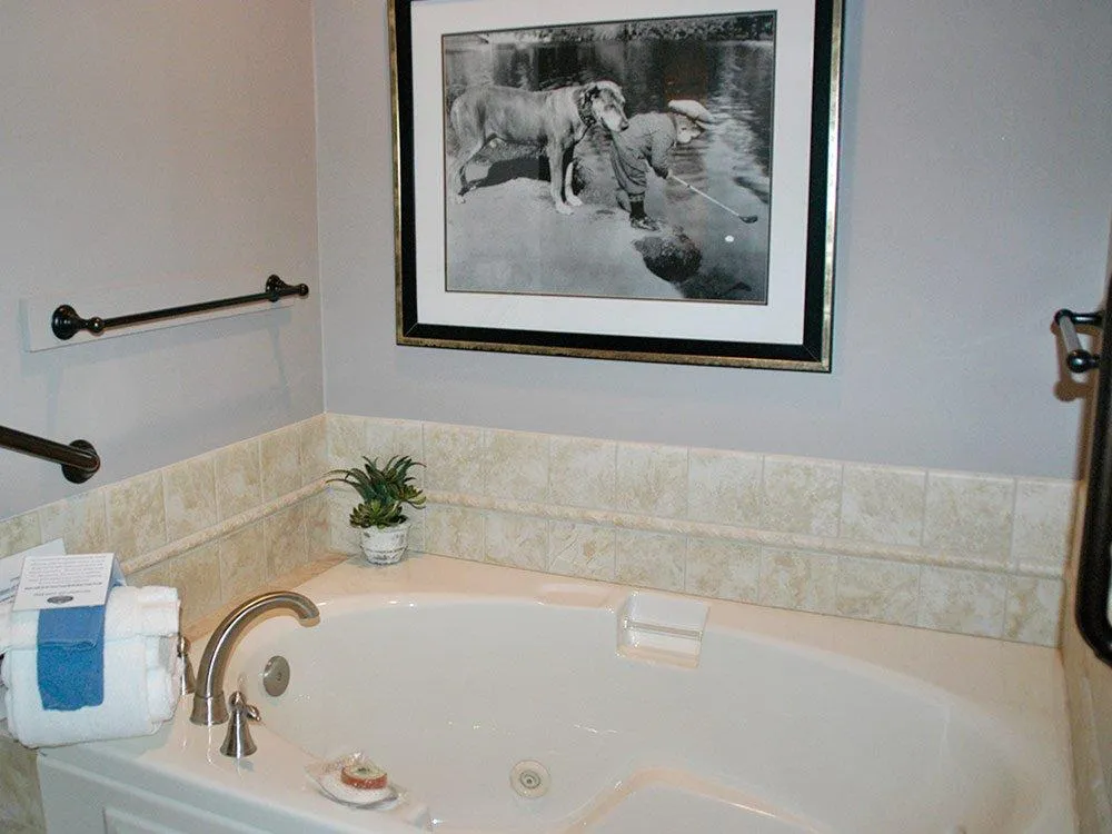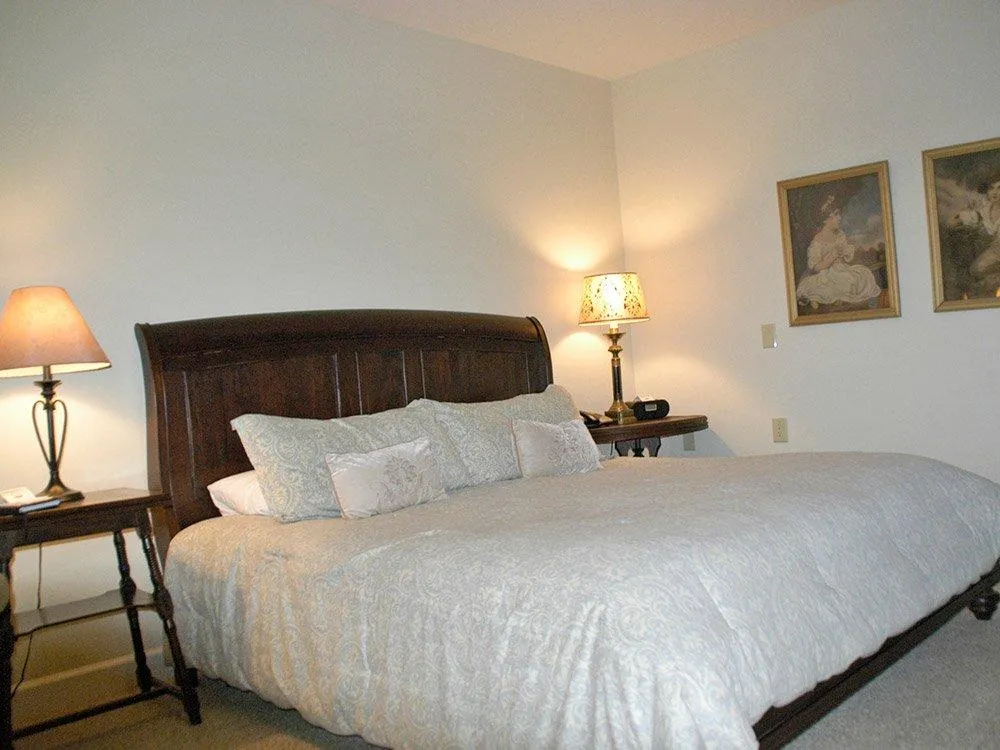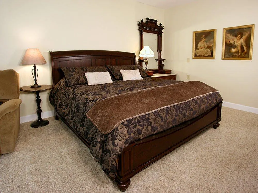 Handicap accessible first-floor Cottage Suite with lower king bed, screened-in porch, overlooking gazebo and courtyard area, remote control gas fireplace with 42" Wi-Fi TV built-in, single serve pod coffee maker (coffee pods supplied), microwave, mini-fridge, dual reclining loveseat, antiques. Deep one person whirlpool tub, walk-in shower.