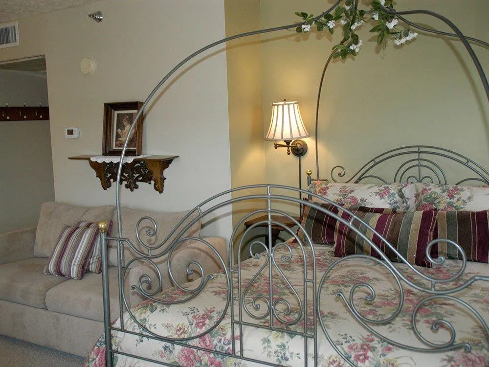 Has a large east window overlooking the village, 1 King bed, a full-size sofa sleeper, and 2 comfortable swivel rockers. Completely new! Opened 10/20/2023. Includes access to a lovely common area with microwave, refrigerator with icemaker and a screened-in balcony. Accommodates 3 guests ($15 additional guest charge, if over 2 guests per night).