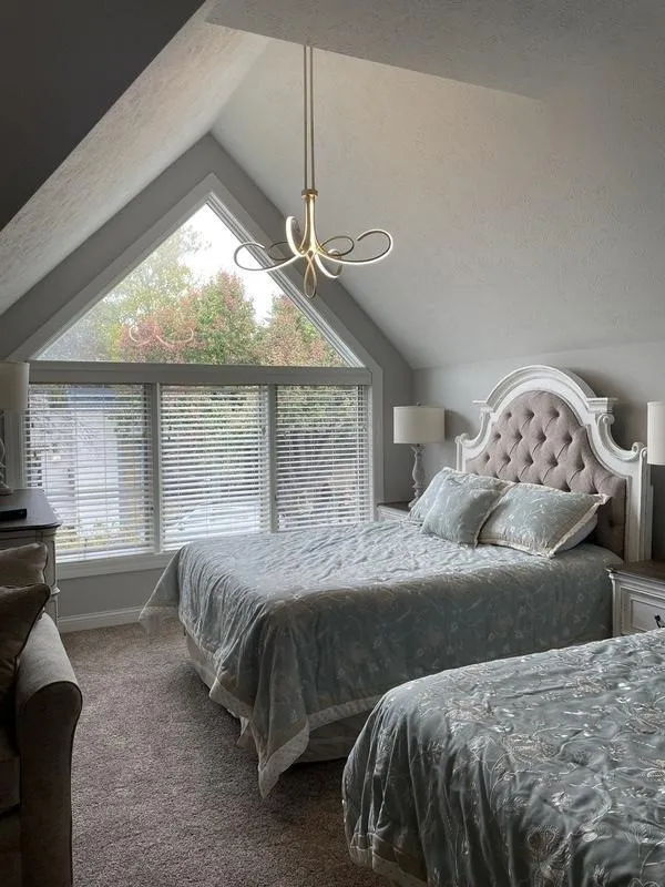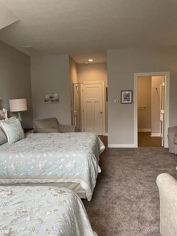 Has a very large north window overlooking Main Street and the village, 2 queen beds, a full-sized sofa bed and 2 comfortable swivel rockers. Completely new! Opened 10/21/2023. Includes access to a lovely common area with microwave, refrigerator with icemaker and a screened-in balcony. Accommodates 5 guests